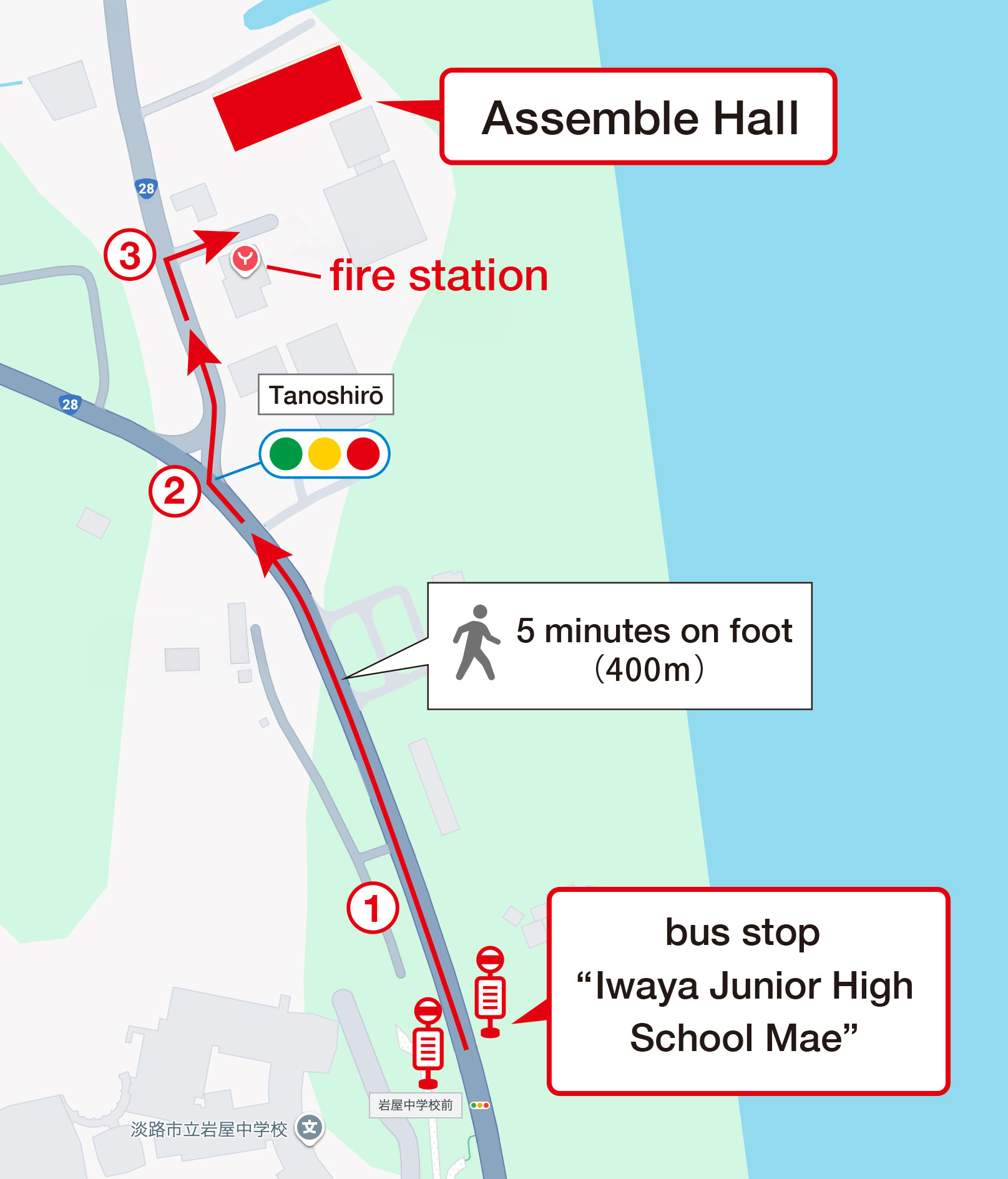 Walking Route from “Iwaya Junior High School Mae” to the Former Assemblee Hall (approx. 5 minutes)