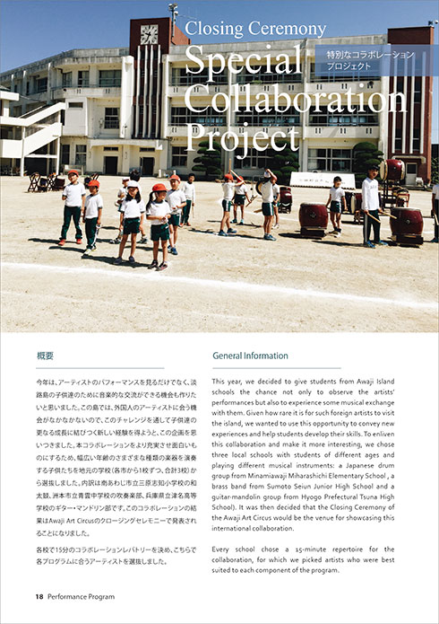 This year, we decided to give students from Awaji Island schools the chance not only to observe the artists’performances but also to experience some musical exchange with them. Given how rare it is for such foreign artists to visit the island, we wanted to use this opportunity to convey new experiences and help students develop their skills. To enliven this collaboration and make it more interesting, we chose three local schools with students of different ages and playing different musical instruments: a Japanese drum group from Minamiawaji Miharashichi Elementary School, a brass band from Sumoto Seiun Junior High School and a guitar·mandolin group from Hyogo Prefectural Tsuna High School). It was then decided that the Closing Ceremony of the Awaji Art Circus would be the venue for showcasing this international collaboration.