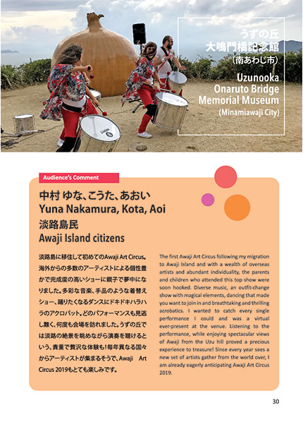 Awaji Island comprises the three cities of Awaji, Sumoto and Minamiawaji, and to promote the whole island, Awaji Art Circus artists perform at one venue in each city, such as Mori no Terrace of Nijigen No Mori (Awaji City), Sumoto Citizen Park (Sumoto City), Uzunooka Onaruto Bridge Memorial Museum (Minamiawaji City).
