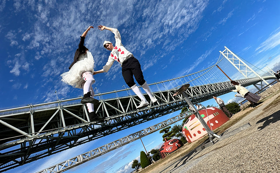 In the performance, the Akashi Kaikyō Bridge, the world's second-longest suspension bridge makes an appearance and serves as the gateway to Awajiland.