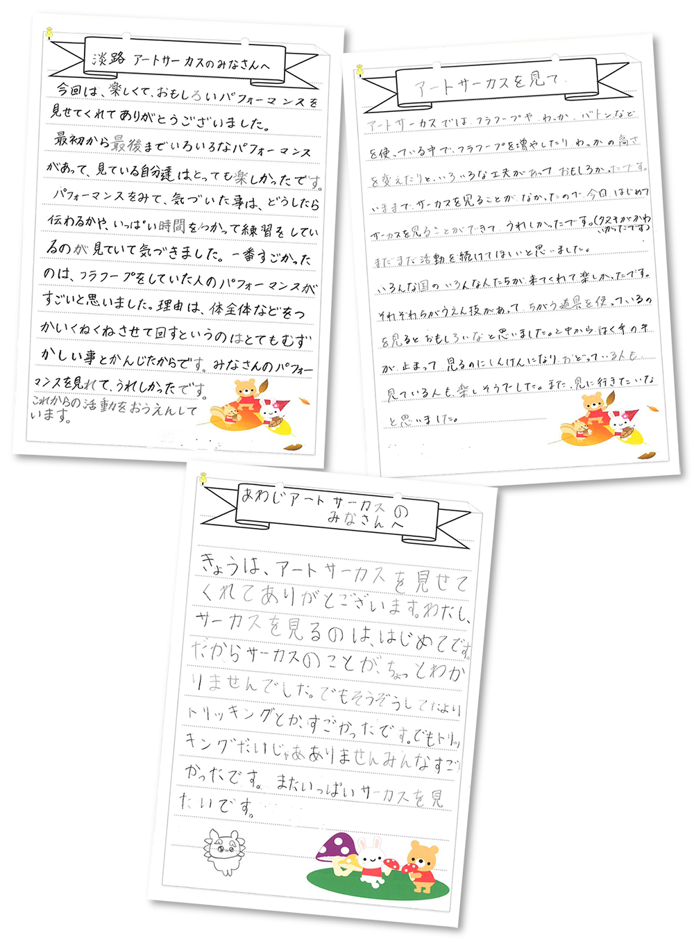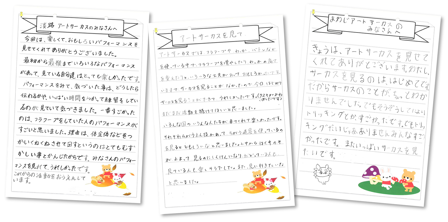 "I truly feel that it was wonderful to have you visit our school. From my perspective, I believe that there are not many children in Awaji City who have had the opportunity to see a circus with their families. When I was a child, circus performances were broadcast on television, so I had a clear image of what a circus was. However, children today might not really know what a circus is.