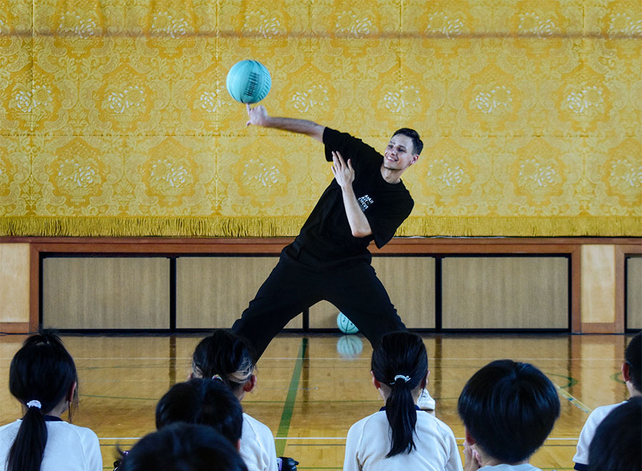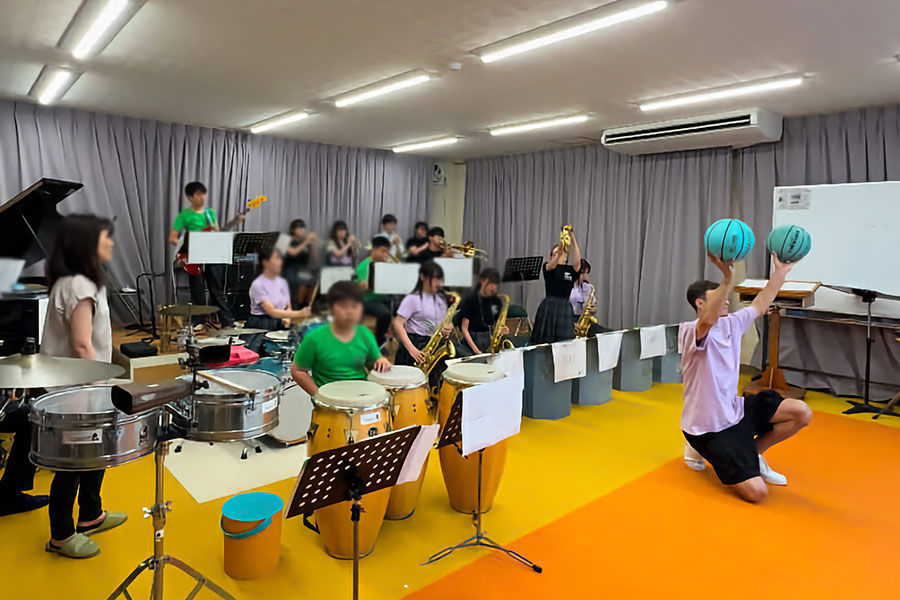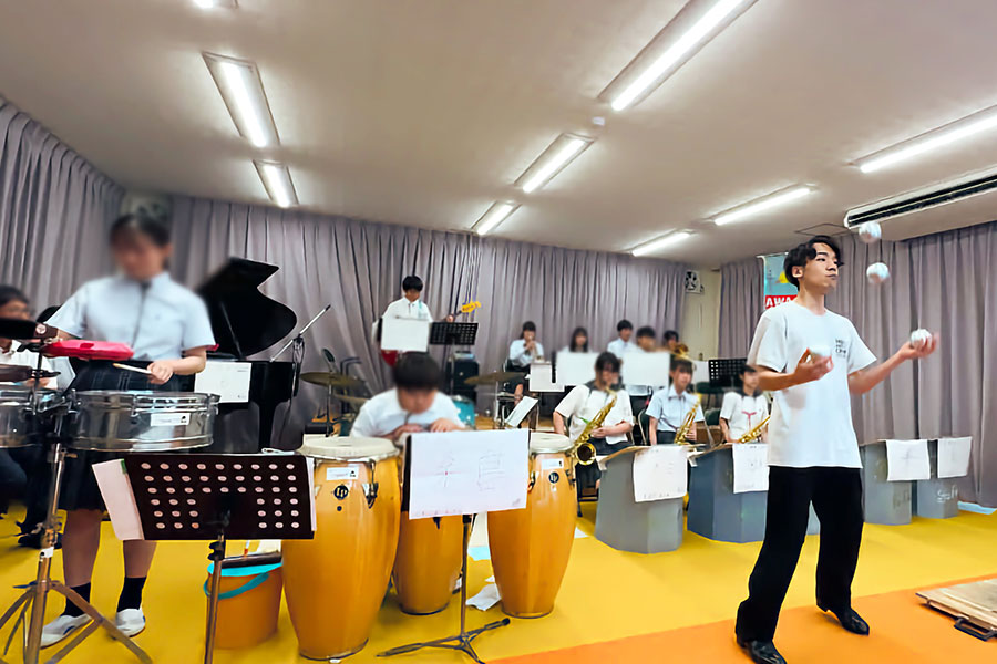 For the first time since 2019, we have realized the long-awaited collaboration performance with Sōkai Junior and Senior High School Jazz Band. Leading up to the performance, members of the jazz band and Awaji Art Circus artists held several rehearsals, carefully harmonizing music and movement. During the first rehearsal, the jazz band members appeared a bit nervous about working with new collaborators, but by the second rehearsal, they had warmed up to each other, and the music and performance began to shine even more. With each rehearsal, the team's bond deepened, resulting in a wonderful finished product.